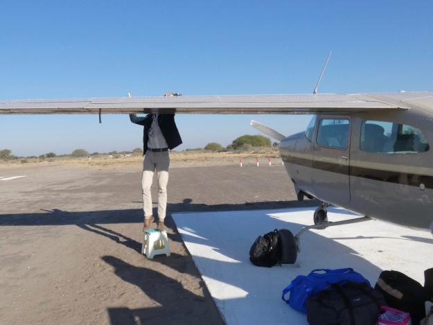 Genau. Die teilen alle Piloten untereinander. In der Natur ist alles in Bewegung sozusagen. So bleiben wir auf dem neusten Stand. Das gehört zur Sicherheit. Ihr habt ja auch bemerkt, dass ich zunächst einmal über die Piste fliege und prüfe, ob es Unebenheiten oder Tiere dort gibt. Grundsätzlich organisiere ich jeden Flug mit Air Traffic Control Network. Dahin übermittle ich den Flugplan mit Route, Flughöhe und Ankunftszeiten. Wir sind übrigen meist in einer Höhe von 3000 Metern unterwegs. Im Okavango Delta flogen wir tiefer, nur 250 bis 500 Meter. Hier gibt es ja keine Anhöhen.