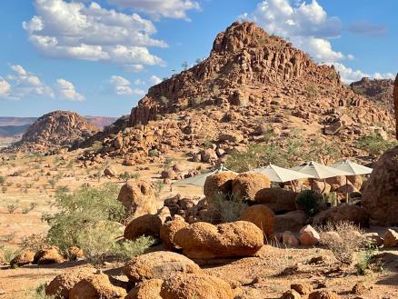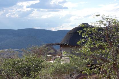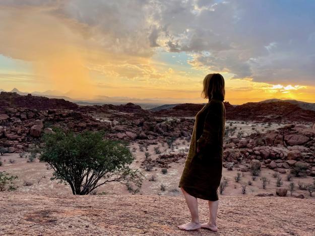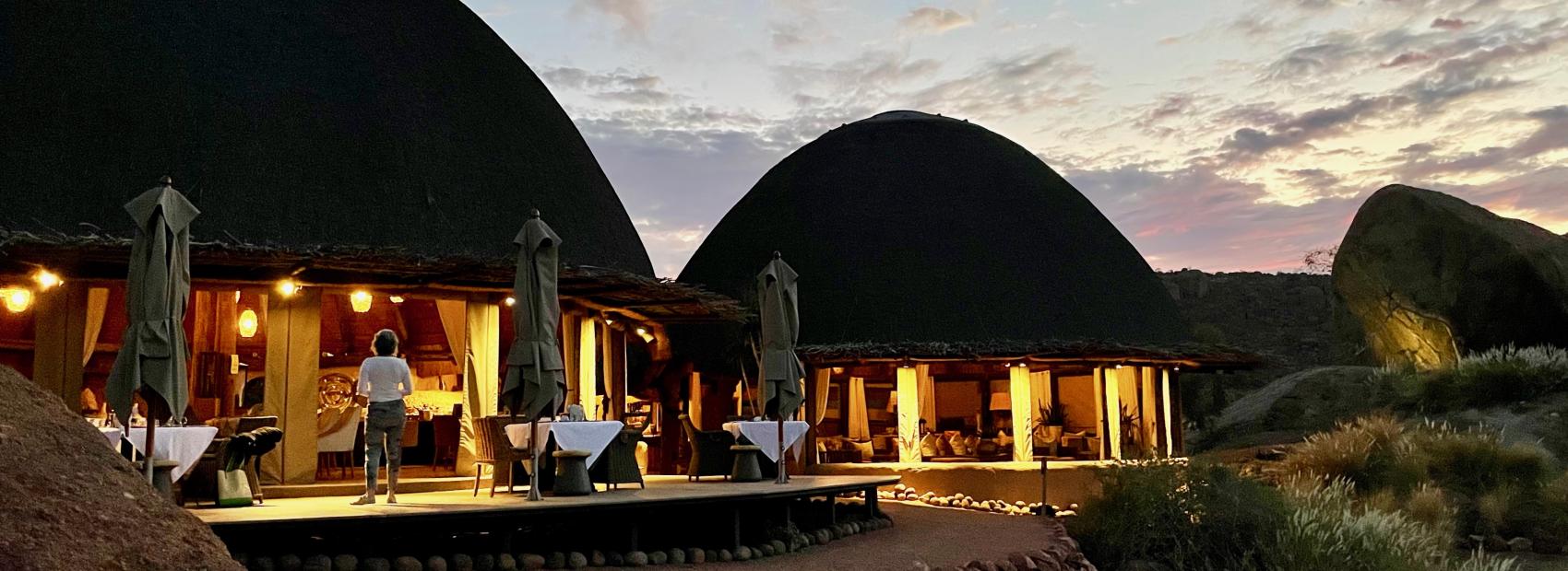 Wir verlassen die Etosha-Region in Richtung Twyfelfontein. Nach drei Stunden Fahrt steigen rote Lavafelsen rechts und links der Teerstraße empor – Vorboten einer atemberaubenden Landschaft im Damaraland. Wir steuern Mowani an. Die Lodge liegt in einer bizarren Umgebung von Kugelfelsen. Trockene Luft umweht uns und die Temperatur erreicht mittags über 35 Grad. In dieser ariden Gegend beziehen wir für zwei Tage unser Chalet im Stil einer Rundhütte. Zum Check-in nehmen wir neben der Vogeltränke Platz. Liebesvögel, Tauben und andere Vögel (wir sollten uns endlich der Ornithologie zuwenden) flattern umher. Auf Mowani ist man der Natur sehr nah. Wie sehr, zeigt der nächste Tag. Doch zunächst verzaubert uns einer der schönsten Plätze Namibias für den Sundowner. Wir betreten oberhalb der Lodge ein Plateau und blicken in die weite Landschaft. In der Ferne regnet es. Die untergehende Sonne verwandelt Regentropfen in Gold … magisch!