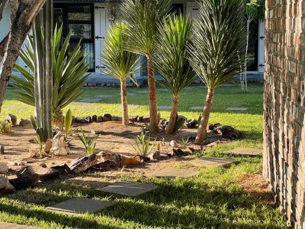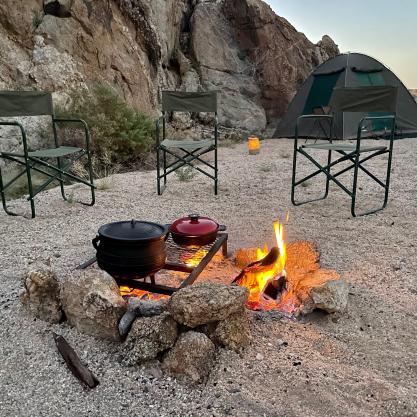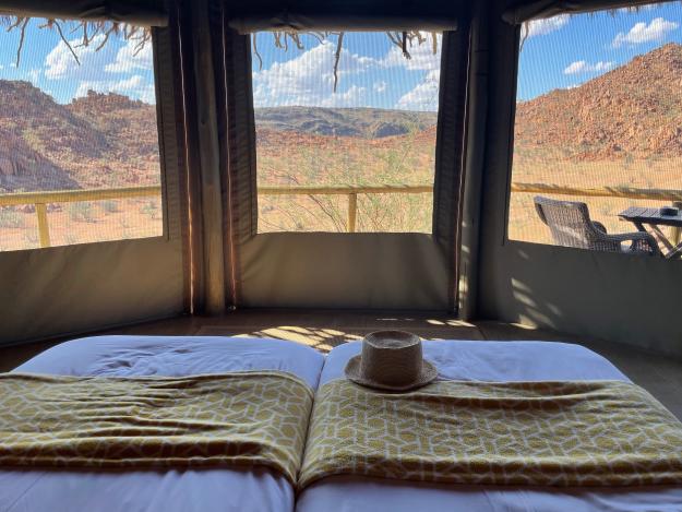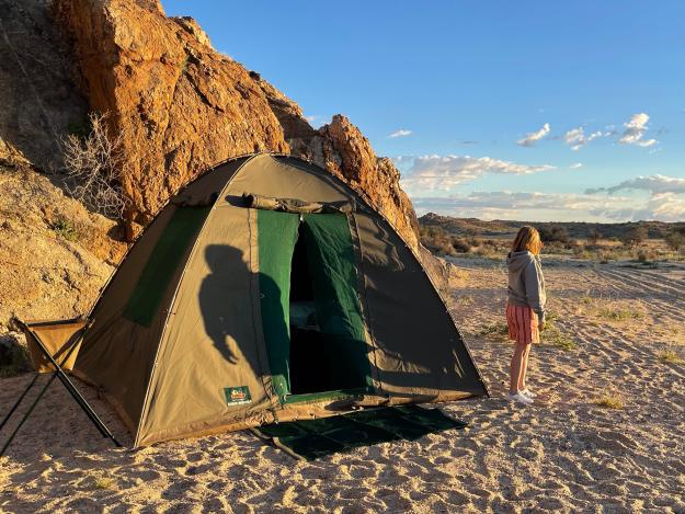 Nach einem erfrischenden Bad im Pool genießen wir unseren Lunch im Cactus Café. Die ehemalige Gärtnerei empfängt uns in luftig-freundlicher Atmosphäre. Der griechische Salat und die Thunfisch-Sandwiches sind köstlich! Jetzt ein paar Kleinigkeiten zusammen packen und los geht‘s zum Sleep Out Richtung Brandberg.