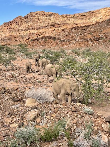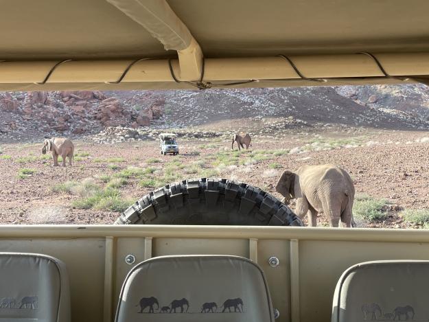 An diesem Morgen war das Glück auf unserer Seite. Der Weg führt am gepflegten Airstrip vorbei und genau hier erkennt Rosie frische Spuren. Sie führen hin und zurück. Hin zur künstlichen und extra gesicherten Wasserstelle der Twyfelfontein Lodge, zurück in die Berge. Sie kombiniert im leisen Selbstgespräch und lenkt den Geländewagen sicher über den steinigen, sandigen Grund. Wahrhaftig: Vor den Felsen stehen die Elefanten und frühstücken frische Pflanzen. Wir nähern uns und Rosie findet im Verlauf der nächsten zwei Stunden immer wieder perfekte Standorte für Beobachtung und Fotos. Wir fühlen uns sicher und Rosie beantwortet alle Fragen. Frischen Kaffee, duftige Muffins und Quiches im Miniformat bietet sie uns obendrein an. Die Stärkung tut gut, denn das einzigartige Naturerlebnis macht hungrig. Friedvolle Stille erfasst uns. Wir sind einfach glücklich.