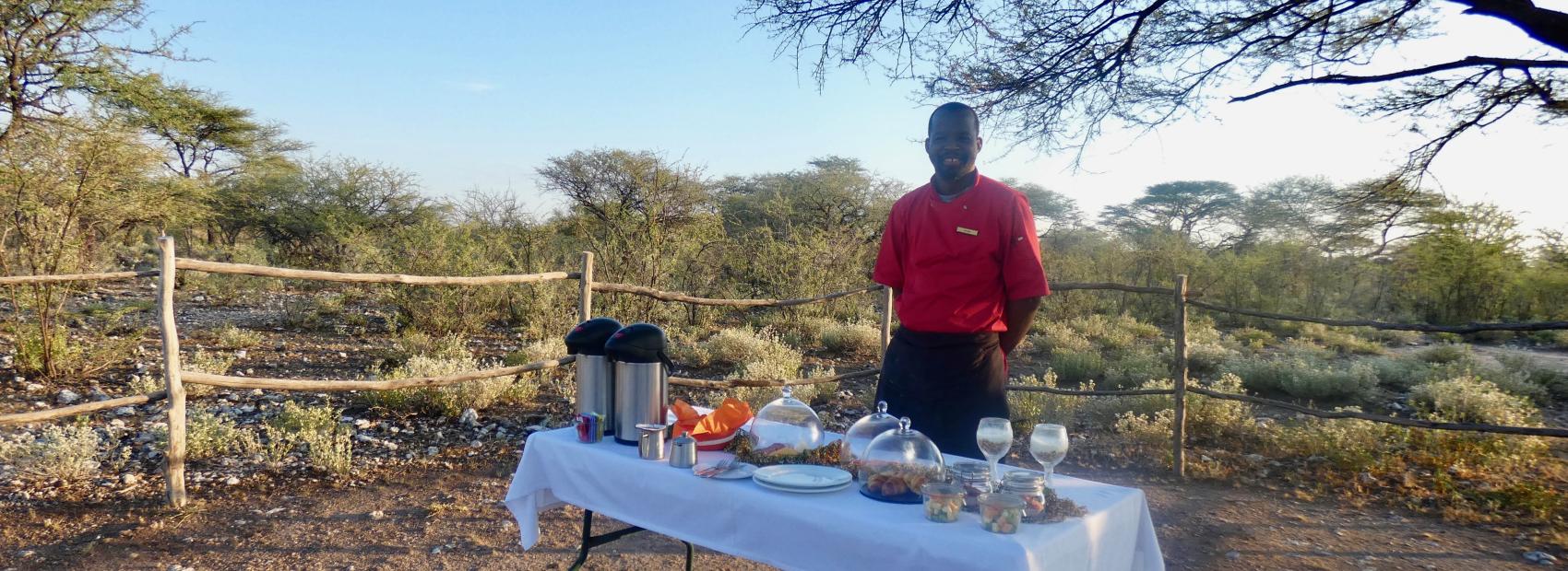 Mit Blick auf die legendäre Etosha-Pfanne: Als Überraschung wurde ein Frühstück im Busch arrangiert