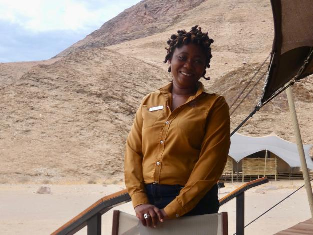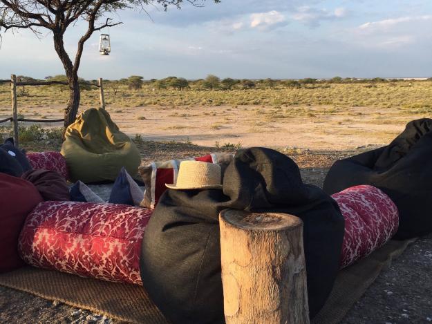 ist es ein Dinner im Hoanib Valley Camp. Thereza, die Managerin für Food and Beverage, versteht ihr Fach. Ihr Team kocht nicht nur famos eine leichte Form der traditionellen, namibischen Küche mit gebratenem Fleisch, Gemüse und Süßkartoffeln, sondern es wird auch apart angerichtet. Wir nehmen am schön gedeckten Tisch im Schein des Lagerfeuers Platz – etwas abseits des Haupthauses, das eigentlich ein Zelt ist. Die Speisen sind teils vorbereitet und werden in kugelförmigen Stoffbehältern warm gehalten. Dieser „Wonderball“ ist aus traditionellen Stoffen genäht, wird oben mit einer Schnur einfach zugezogen und bei Bedarf schnell geöffnet. Ein Accessoire, das wir beim nächsten Besuch sicherlich mitnehmen für die eigene Gartenparty. Auf das Dessert folgte eine sehr persönliche Gesangsdarbietung des gesamten Teams. Leise und melancholische Töne waren ebenso zu hören wie freche Geschichten, die wir leider nicht verstanden aber den Inhalt wir erahnen konnten. Applaus für dieses Gefühl der herzlichen Wärme!