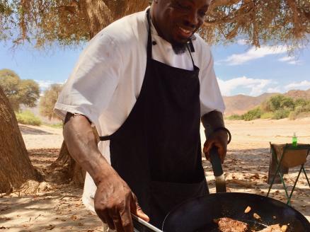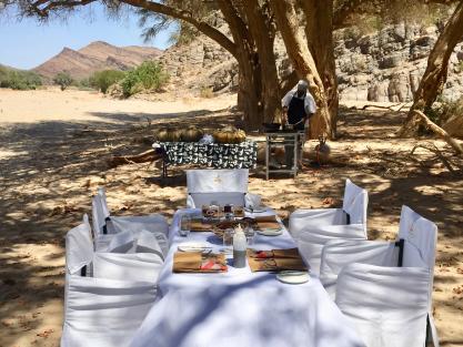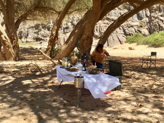 Auf halber Strecke zum Ziel wurde für Sie ein Restaurant plein air installiert. Auch hier ist an alles gedacht. Sogar ein mobiles Handwaschbecken gibt es! Sie werden es schätzen, denn Sand und Hitze sind Ihre Begleiter – zumindest im März und April, als wir das letzte Mal das karge und abgeschiedene Kaokoland besuchten. Ihr Koch bereitet das dreigängige Menü à la minute – nicht zu heiß und nicht zu kalt. Eine willkommene Pause während Ihrer Tages-Safari.
