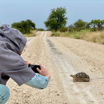 Frühstück servieren alle Gastgeber coronagerecht am Tisch. Das selbstgebackene Brot duftet und schmeckt richtig lecker. Wir finden das erste Souvenir im Curio-Shop und verabschieden uns von Helena. Unser Weg führt direkt durch den Etosha Nationalpark. Zeit für den Besuch von Wasserlöchern haben wir leider nicht und so begegnen wir ein paar Straußen, sehen am Horizont eine Elefantenherde sowie Zebras und Gnus. Ganz nah kommen wir einer Schildkröte … aber soviel sei hier verraten: Wir treffen im Verlauf unseres Educational Trips auf größere Tiere.