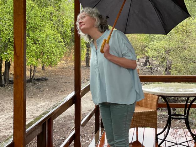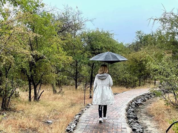Der Regen kann unsere Freude nicht schmälern. Unsere aufmerksamen Gastgeber bringen Regenschirme zum Chalet – wir fahren und wandeln gut geschützt durch die Anlage von Mushara. Das Management hält alle drei Lodges in Schuss und ist bereit für die Namibiabesucher.