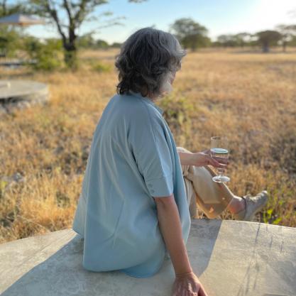 Wir sind absolut begeistert von der Gastgeberschaft. Mervin serviert am späten Nachmittag zunächst einen ausgezeichneten, in Namibia produzierten Gin. Den Sundowner nehmen wir auf einer separaten, runden Terrasse zu uns. Selbst wenn die Lodge komplett ausgebucht ist, findet man hier ausreichend Privatsphäre mit Blick auf die Wasserlöcher. Später am Abend überzeugt das 5-Gang-Menü. Es gibt Springbock, perfekt nach dem persönlichen Wunsch gebraten. In der Abenddämmerung besucht eine Nashornfamilie das Wasserloch … wieder ein magischer Moment in Namibia.