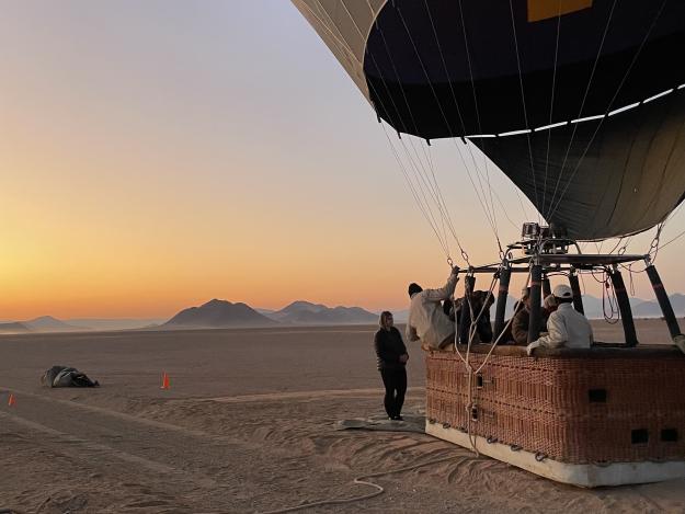 Kurz vor Sonnenaufgang steigen Sie in den Ballon und heben sanft ab. Während der etwa einstündigen Fahrt genießen Sie den atemberaubenden Ausblick auf die erwachende Wüstenlandschaft.