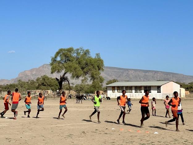 Zu Beginn des Jahres 2024 hat sich das Projekt wunderbar entwickelt. In Sesfontein wurde das Trainerteam auf drei Personen erweitert und in Warmquelle sind zwei Trainer fest eingestellt worden. An beiden Orten hat sich jeweils eine Mädchenmannschaft für Netzball gebildet. “Volleyball soll es für Mädchen bald auch geben”, stellt Leander in Aussicht.