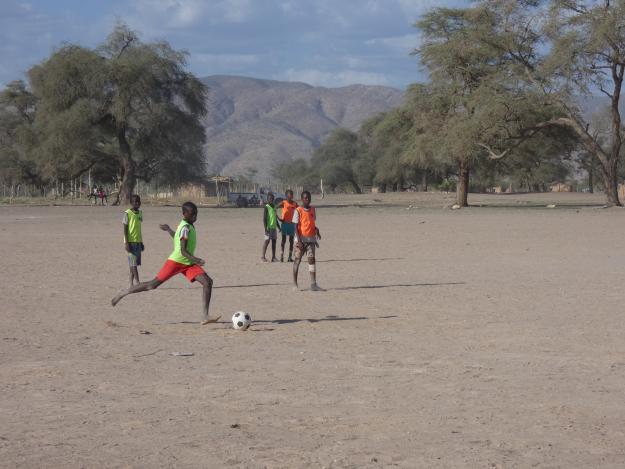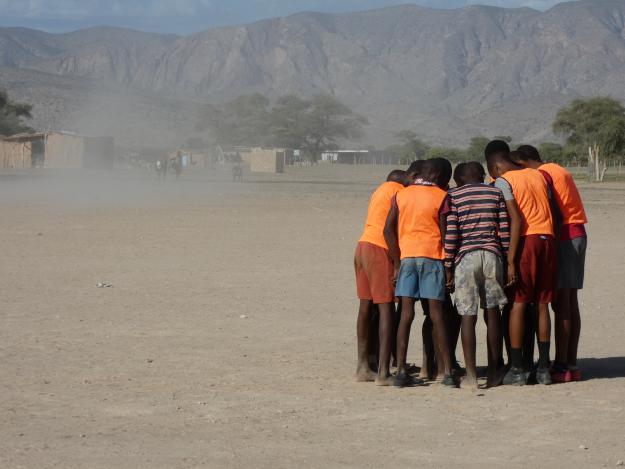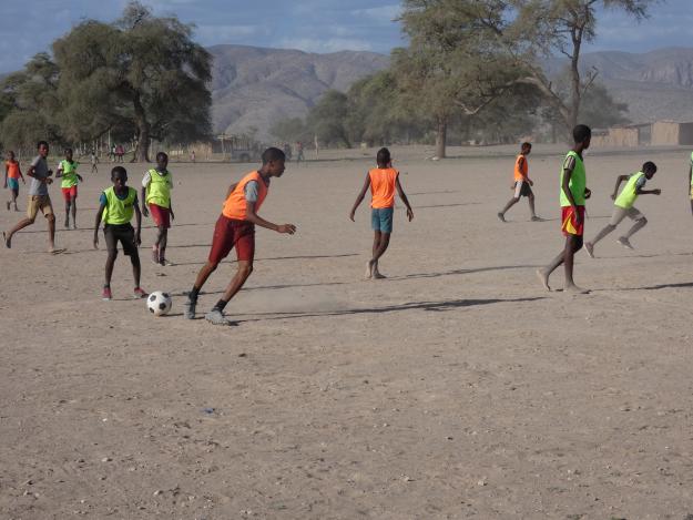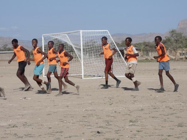 Wer nachmittags in Sesfontein ankommt, hat vielleicht Glück und hört von Weitem das fröhliche Rufen. Jungen und Mädchen spielen miteinander Fußball. Sie trainieren für das Match gegen die Gleichaltrigen aus Warmquelle – 23 Kilometer östlich gelegen.