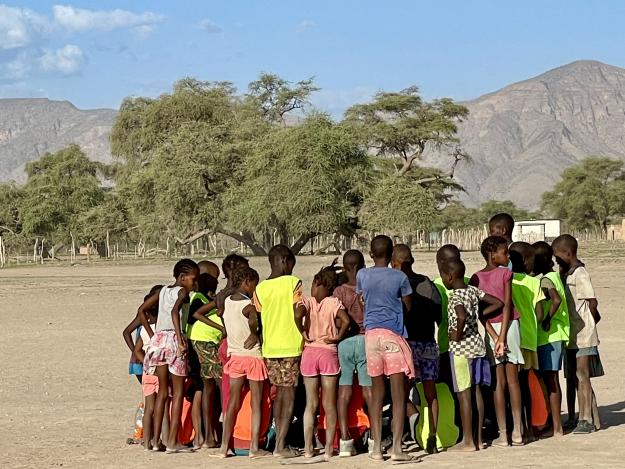 Er wusste, dass es nach der Schule für die Kinder der Region keine Angebote gab. Die Eltern müssen arbeiten oder haben nicht die Möglichkeit, dem Nachwuchs etwas zu bieten. So startete er 2022 das Sportprogramm – zunächst in Sesfontein und anschließend in Warmquelle. “Weil fast jeder Junge und jedes Mädchen vor den Ball treten kann, gab Fußball den Impuls”, erinnert sich der gebürtige Namibier. Leander engagierte zwei Fußballtrainer, die sich um die Kinder kümmern. Außerdem wurden Bälle, Trikots und Tore angeschafft.
