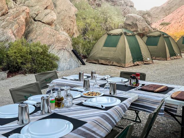 Alles wurde vorbereitet: die bequemen Feldbetten stehen im schützenden Zelt, der Tisch ist gedeckt und auf dem Feuer köchelt das „Potjie”, ein duftender Eintopf. Nur ein paar Schritte und man wandelt im schönsten Garten Namibias. Die Regenzeit war im Mai bereits vorbei. Doch die Natur blühte noch immer in der geschützten Lage. Der Ort ist einfach magisch. Nach der Stille genießt man das gesellige Beisammensein zum Sundowner und am Lagerfeuer.