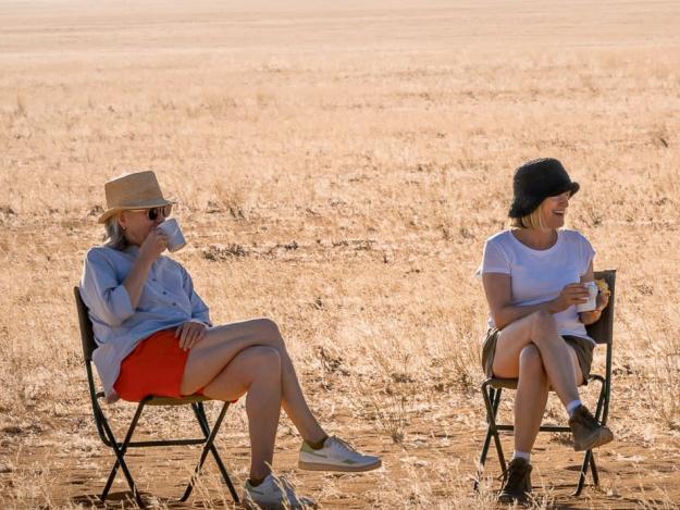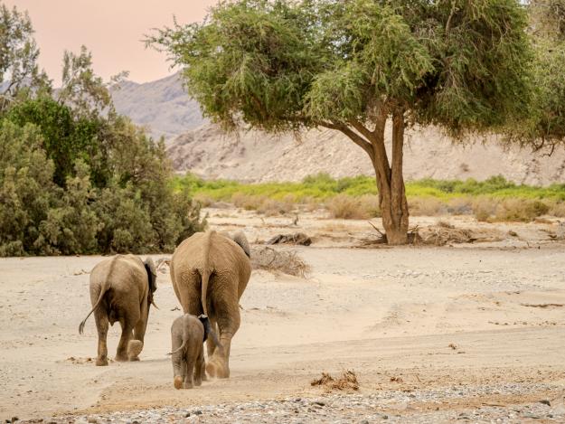 Nach dem reichhaltigen Frühstück, das die Gastgeber appetitlich herrichten, startet die Safari in die Wilderness. Wüstenelefanten, Springböcke und Giraffen kreuzen den Weg durch das trockene Bett des Hoanib. Manchmal sichtet man die Wüstenlöwen. Wer mag, verbindet die Safari direkt mit einem Sleep-out.
