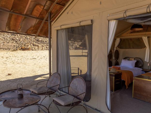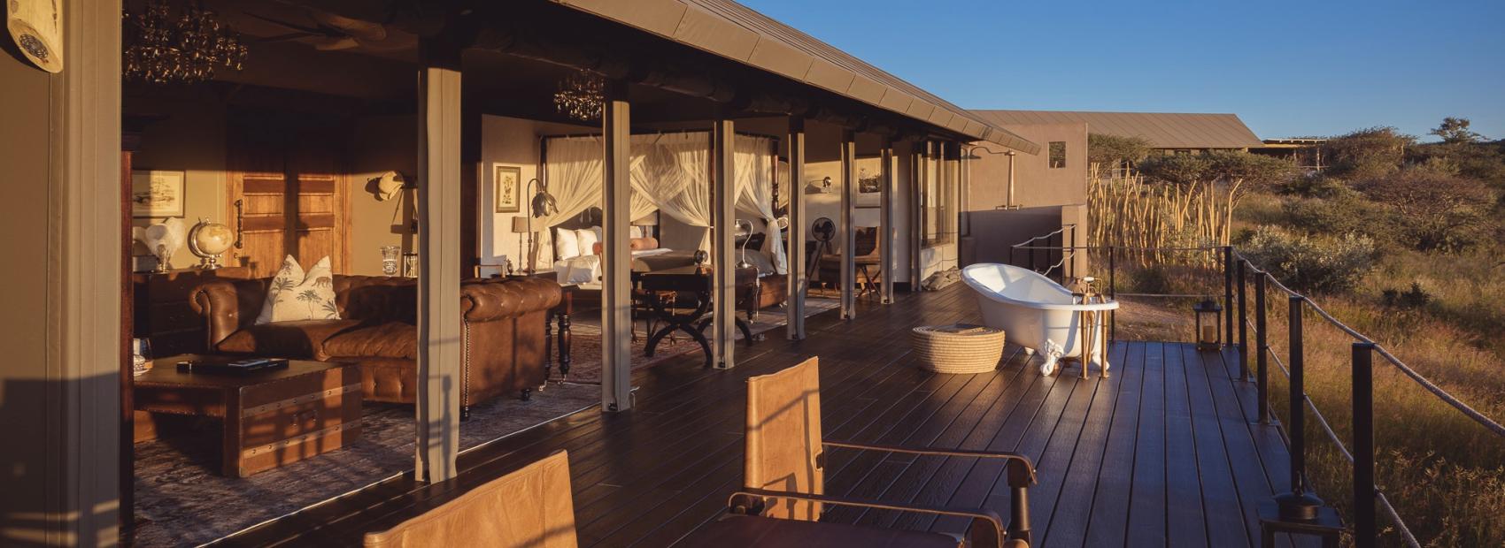 Der Weg führte durch scheinbar endlose Weiten in das Zentrum des Damaralandes. Hier erlebt man absolutes Safari-Feeling. Auf einem Hügel liegt die Lodge: das Ohorongo Tented Camp. Ein Geheimtipp für Menschen, die Bezug zur Natur mit ausgezeichnetem Komfort verbinden wollen.