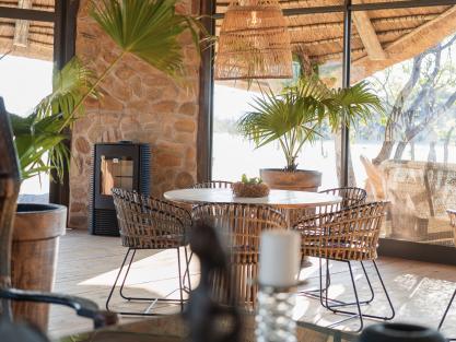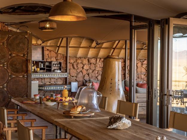 Das Interieur der gesamten Lodge wirkt angenehm anders. Es spielt mit Farben und Formen der Wüste Namib. So bilden von der Sonne gebleichte Baumstämme die Konstruktion im Außenbereich der Main Area. Sie zitieren das Deadvlei. Rottöne in verschiedenen Nuancen korrespondieren mit dem typischen Dünensand der Umgebung und stimmen ein auf die Aktivitäten in der Natur.