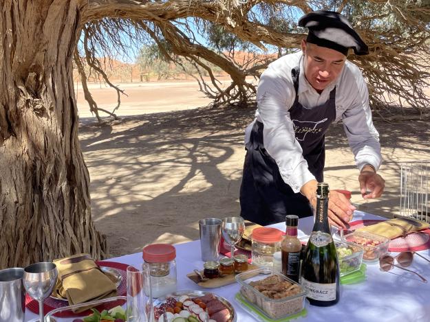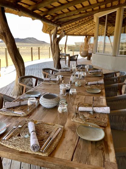 Viele Aktivitäten sind möglich. Von hier startet man zu den Felsmalereien von Twyfelfontein. Oder unternimmt mit dem E-Bike eine Erkundungsfahrt. Oder man spürt den Wüstenelefanten nach. Wieder zurück nehmen Sie köstliche Düfte wahr: Der Steinofen ist bereits in Betrieb und das Team bereitet den Sundowner vor. Man wird kulinarisch rundum verwöhnt.