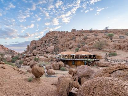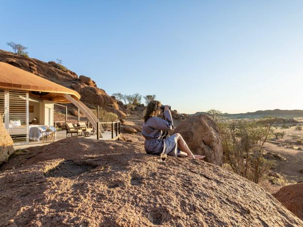 Wie ein Juwel liegt Onduli Ridge in der bizarren Landschaft des Damaralandes. Die runden Chalets nehmen die Form der kugeligen Felsen perfekt auf. Das Gestein ist Teil des Interieurs – um nur ein Detail zu verraten. Sämtliche Bereiche jeder Suite gehen fließend ineinander über. Man genießt echten Luxus, der mit feinem Understatement überzeugt.