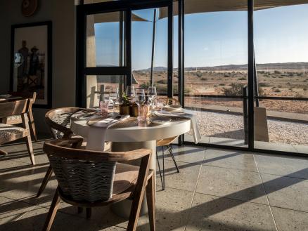 Schauen, so weit der Blick reicht – auch die Hauptgebäude von The Desert Grace bezaubern mit Transparenz. An der Bar oder auf dem Deck schmeckt der kreativ gemixte Sundowner. Bei Ihrem Dinner treffen Sie andere Gäste oder Sie genießen die Zeit zu Zweit – Ihre Wünsche werden sicher erfüllt. Denn: Es ist Ihre Privatreise durch Namibia!