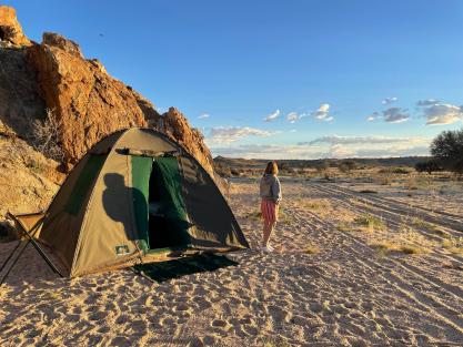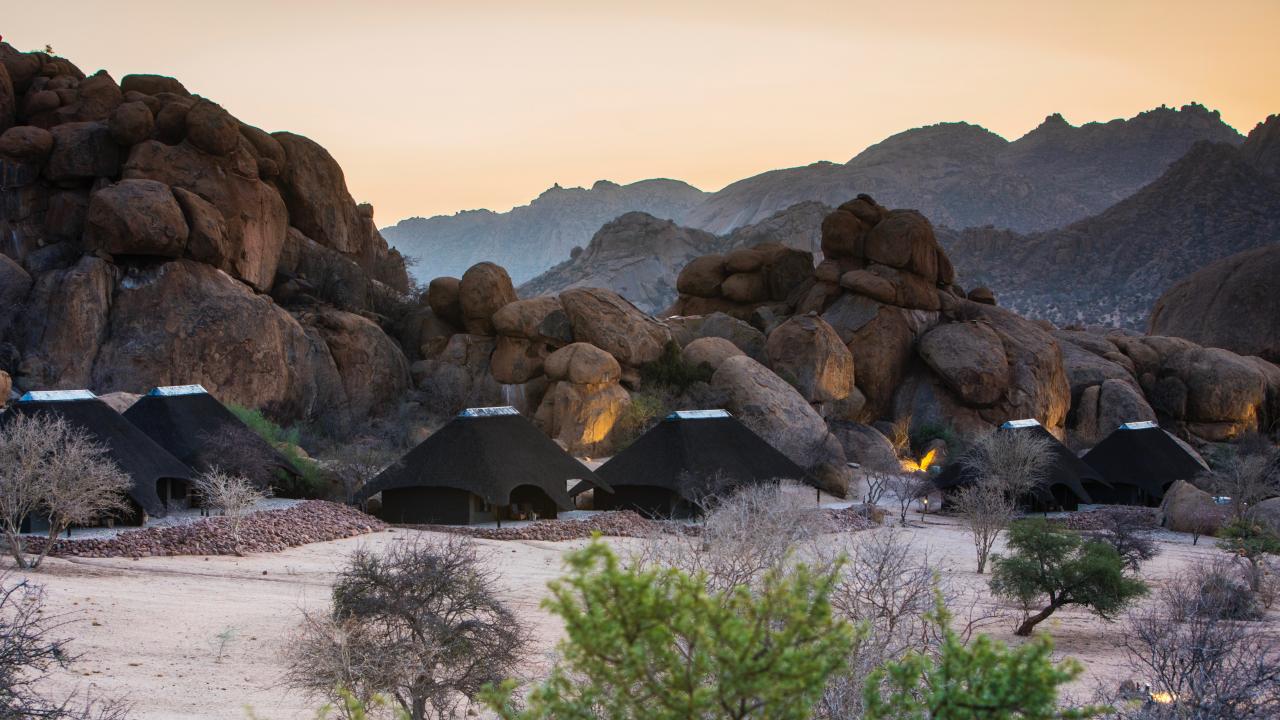 Der Sonnenuntergang taucht das Brandbergmassiv in feuriges Licht – eine von tausend Inszenierungen des Gebirges. Sie genießen Ihren Gin Tonic oder ein kühles Bier und dürfen sich auf die exquisite wie gesunde Küche des Hauses freuen. Oder Sie buchen ein Sleep-out. Nach dem rustikalen Essen am Feuer übernachten Sie in einem komfortablen Zelt. Unvergesslich!