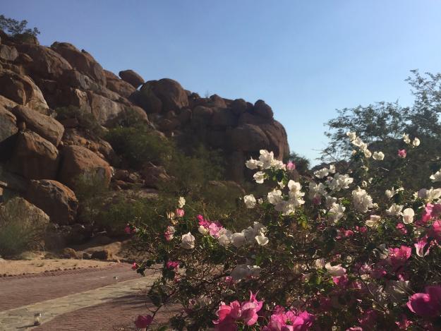 Filigran der Wuchs, Burgunderrot die Blüten: Mushara Bäume spenden auf dem gesamten Areal der gleichnamigen Lodge kühlenden Schatten. Nach Ihrer Safari im Etosha National Park empfängt Helena Sie mit einem selbstgemachten Eistee – in Mushara Outpost finden Sie Ruhe und Entspannung.