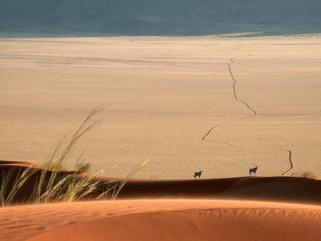 Die Silhouetten der Oryx-Antilopen erscheinen schwarz vor dem Rot der Dünen. Das zarte Gras wiegt silbern im Wind. Der Himmel färbt sich von Stahlblau über Seladongrün zu Ultraviolett. Nachts umfängt Sie tiefes Schwarz, vor dem Milliarden Sterne funkeln. Jeder Blick: wie gemalt.
