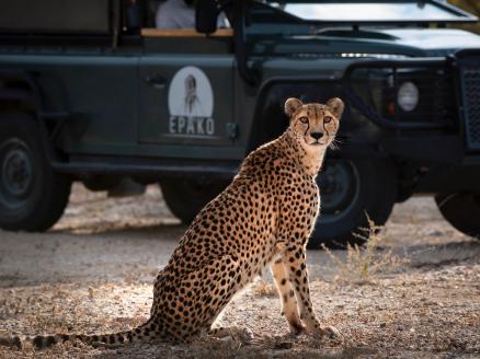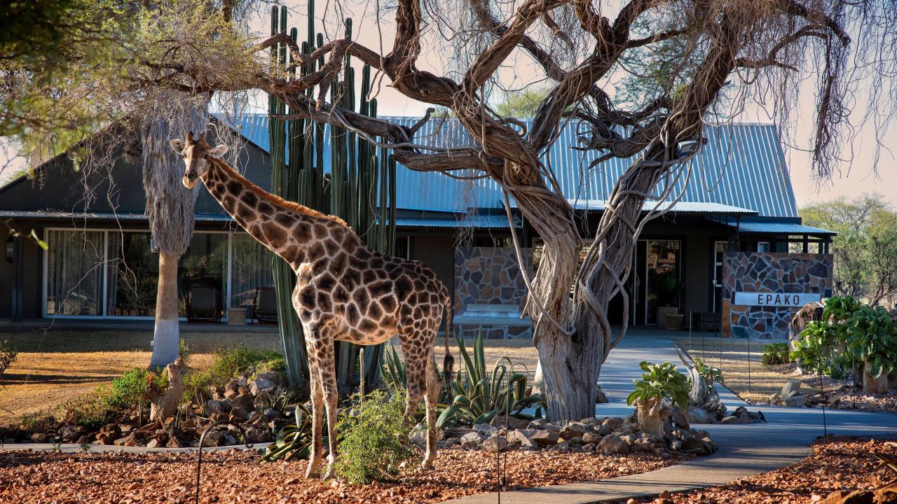 Zum Empfangskomitee gehört die zahme Giraffe Oskar – ein Weibchen, wie man inzwischen weiß. Sie ist Botschafterin von Namibias Tierwelt. In dem privaten Reservat leben neben Nashorn und Leopard beispielsweise auch Hyänen, Geparden, Damara Dikdiks, Bergzebras und Löffelhunde. Per Game Drive oder als Bushwalk erschließt sich die beeindruckende Natur, zu der auch 170 Vogelarten gehören. Ein Tag, wie nur Namibia ihn schenkt, endet mit einem Sundowner und dem exzellenten Dinner.